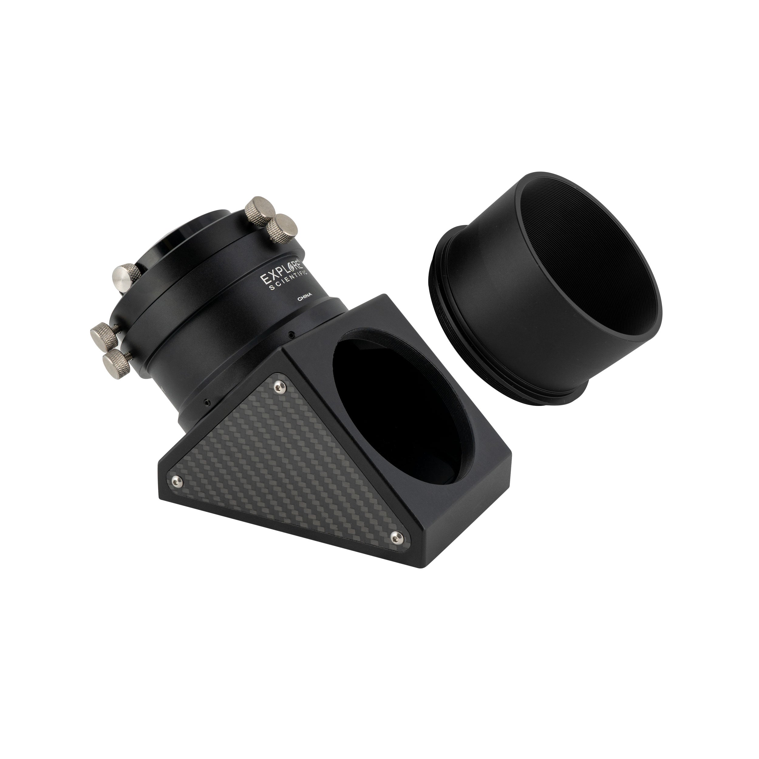 Le canon d'insertion est à double cône, il peut donc être inséré ou retiré en douceur du porte-oculaire. La partie large du cône empêche la diagonale de tomber accidentellement du porte-oculaire si la vis de réglage se desserre. Les oculaires sont fixés dans la diagonale avec un verrou à bague de compression sur le porte-oculaire de deux pouces et le porte-oculaire de 1,25 pouce (vendus séparément).