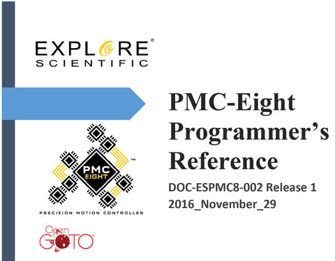 The Explore Scientific PMC-Eight® Controller Programmer’s Reference contains the information needed to communicate and use the base controller command language. The attached document contains the system description and other data used to create programs to control the PMC-Eight®.