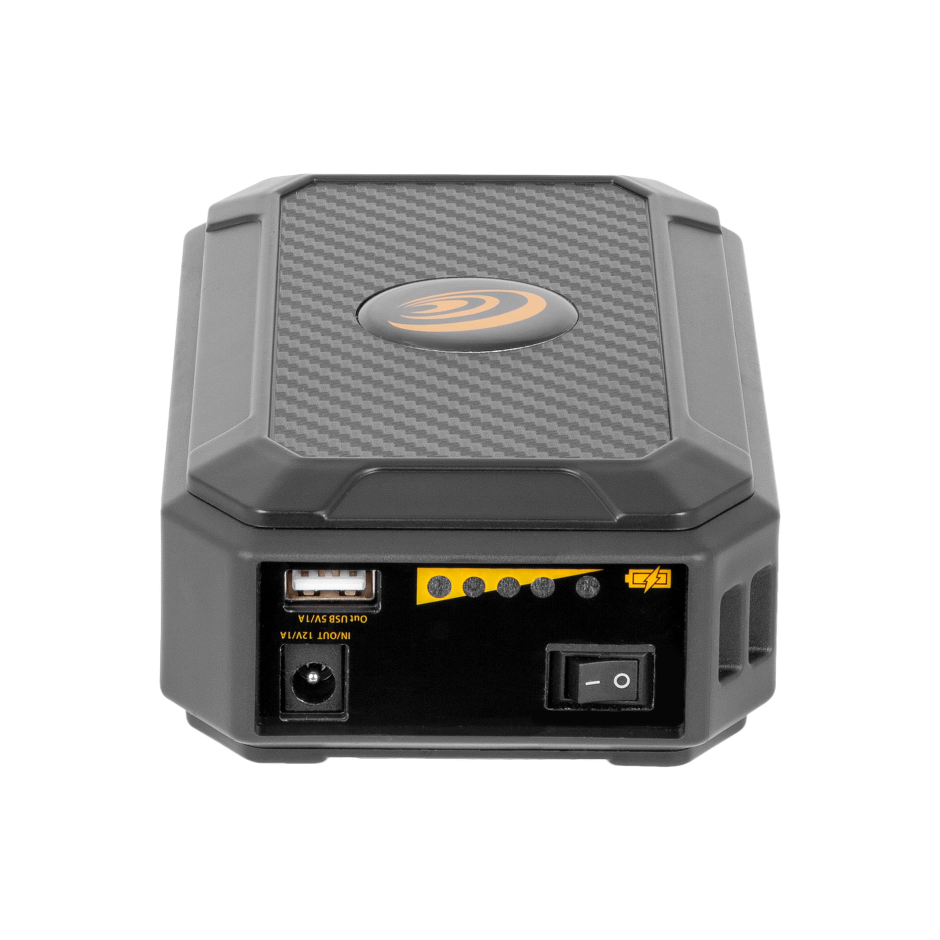 Slightly smaller than a building brick and weighing only 1.4 pounds, the rugged rubber covering protects the battery from minor impacts and seals the red LED flashlight on/off switch from dirt and moisture. The five level indicator shows power availability. The unit is turned on or off with a toggle switch. A convenient 2-point attachment point allows you to hang the battery near your equipment.