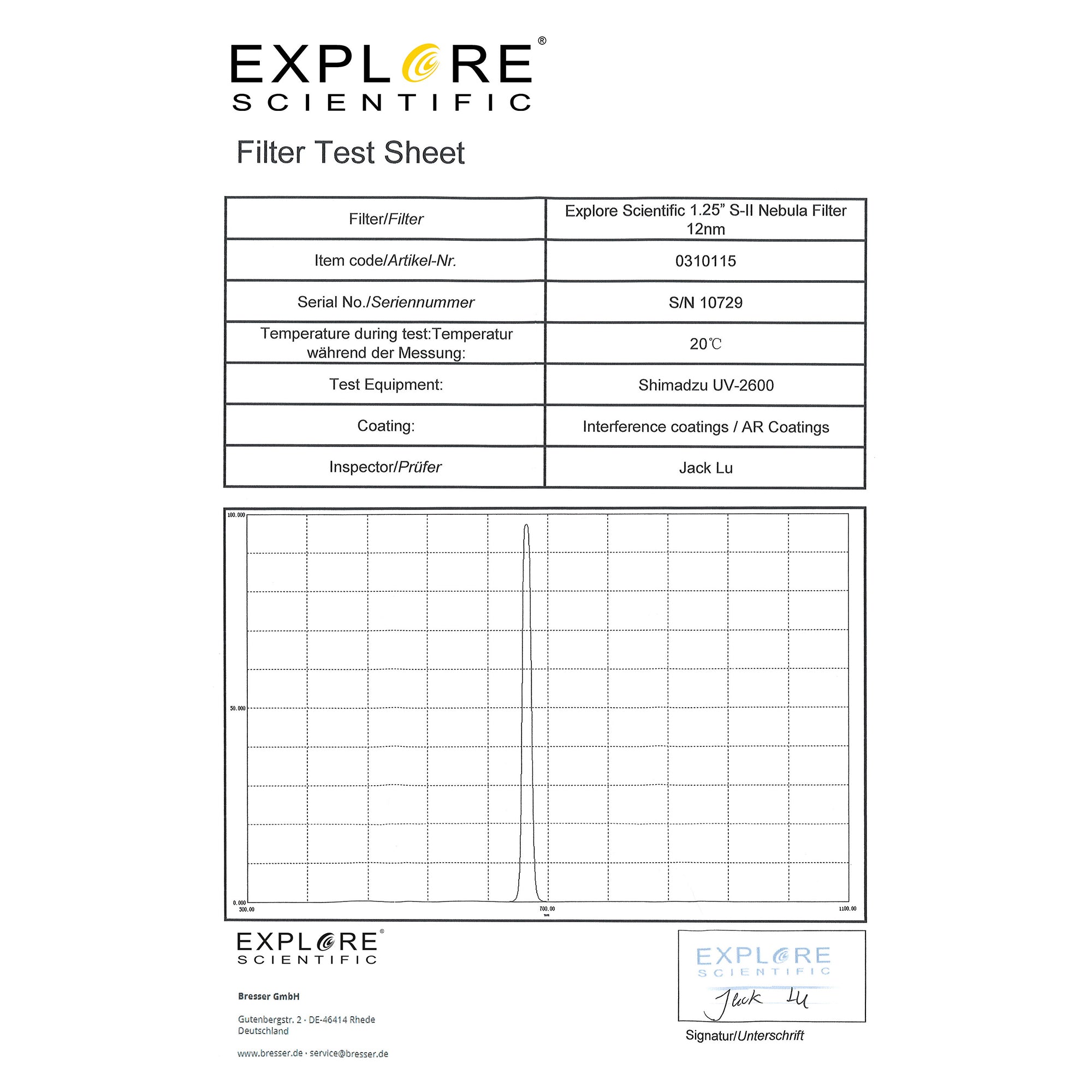 - High quality Explore Scientific S-II filter